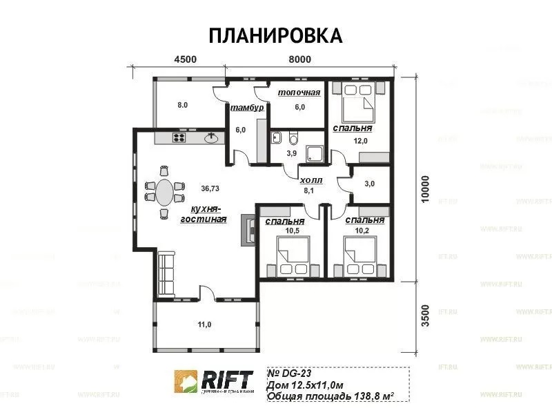 Проект дома из профилированного бруса DG23 площадью 138 м² (13×11 м) сочетает в себе надежность, практичность и комфорт. Профилированный брус гарантирует ровные стены и хорошую теплоизоляцию. В проекте предусмотрены просторная гостиная, несколько спален и хозяйственные помещения. Доступна установка свайно-винтового фундамента, утепление стен и крыши, а также проведение инженерных сетей.