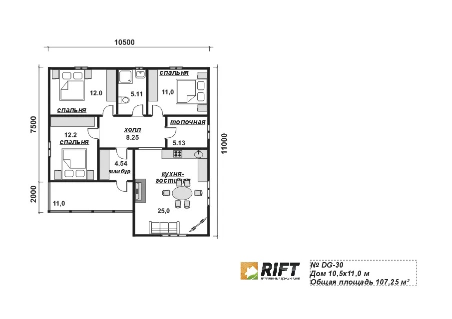 Каркасный дом DG30 — функциональный проект площадью 107 м² с размерами 10,5×11 м. Подходит для семейного проживания. Срок строительства — 45 дней. Доступны базовая и премиум комплектации с возможностью установки свайно-винтового фундамента, утепления и подключения коммуникаций. Предусмотрена поэтапная оплата, ипотека и использование материнского капитала. Бесплатная доставка стройматериалов до 100 км.